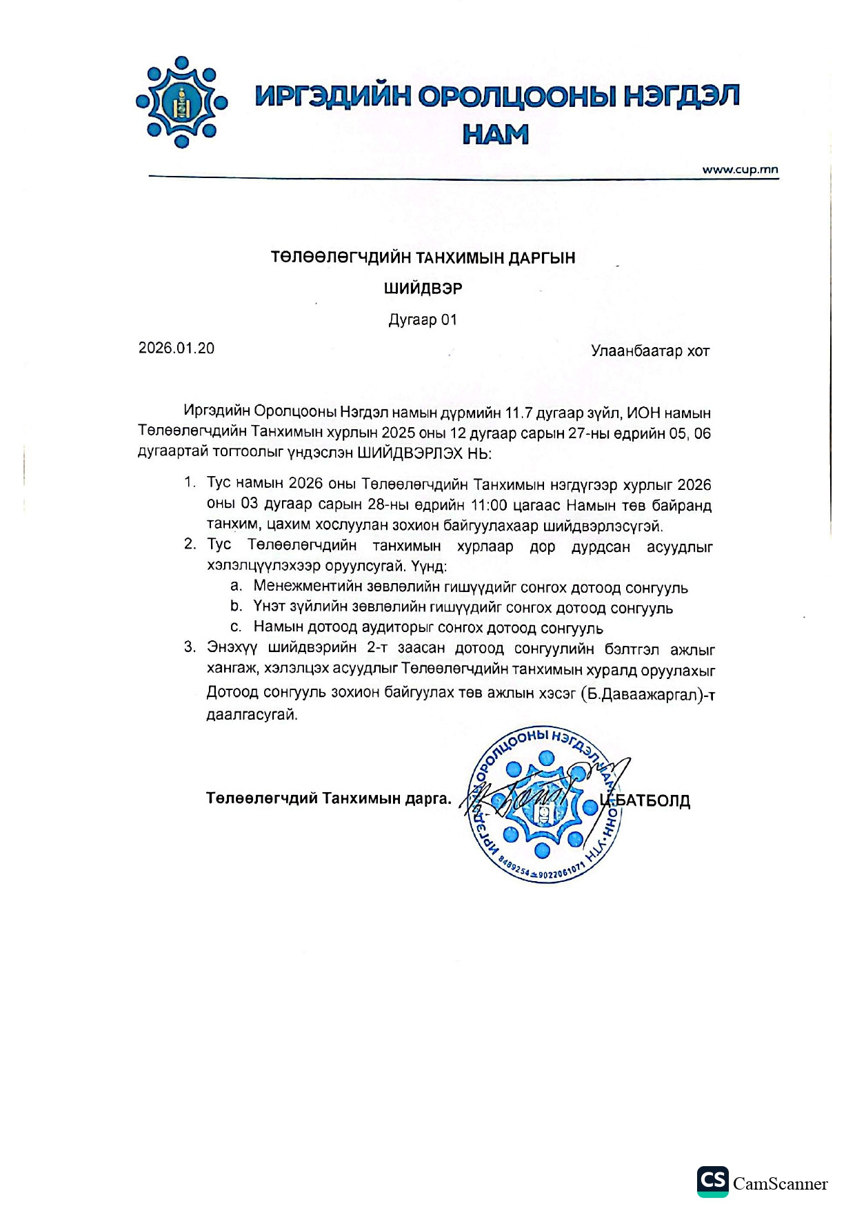 ИОН намын Төлөөлөгчдийн Танхимын даргын 2026 оны 01 дүгээр сарын 20-ны өдрийн 01 дугаартай шийдвэрээр тус намын "Менежментийн зөвлөл"-ийн гишүүдийг сонгох, &...