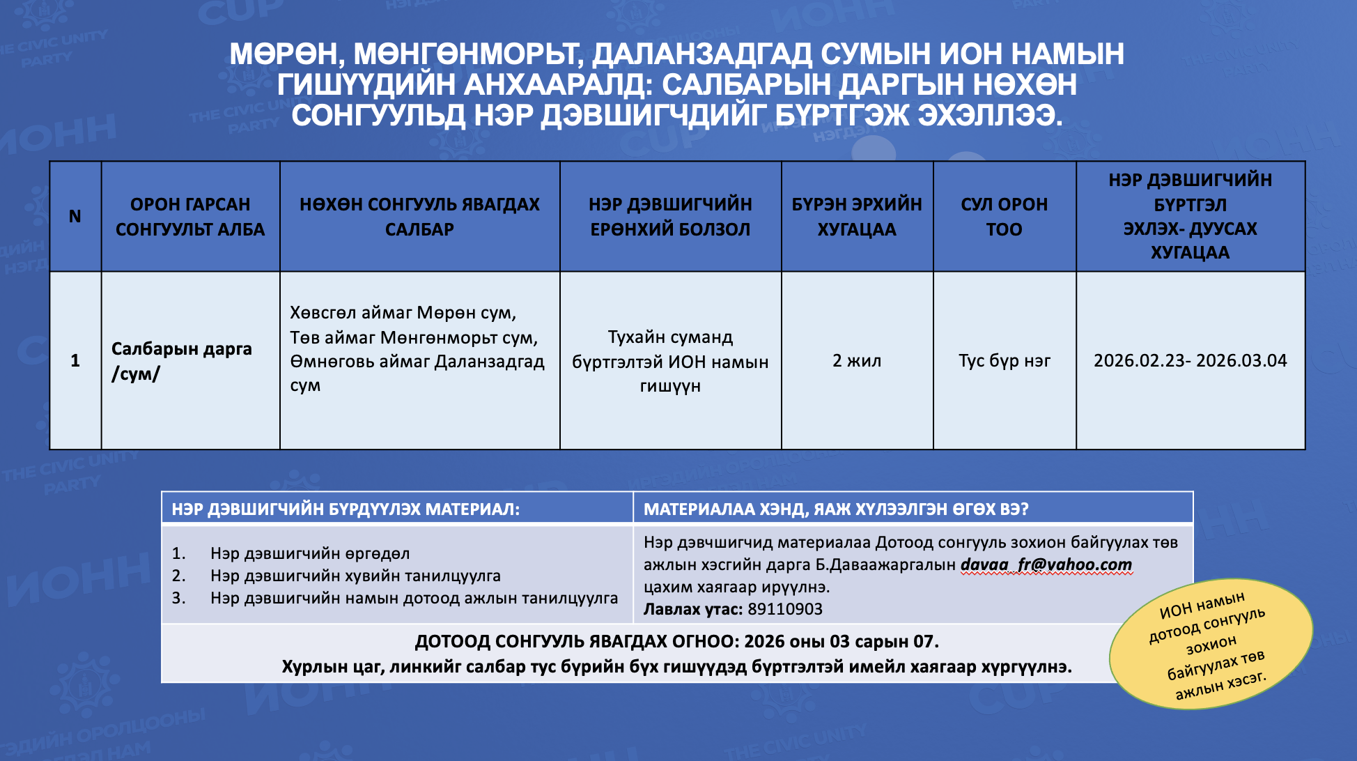 ИОН намын зарим төв байгууллагад дотоод сонгууль зарласныг Дотоод сонгууль зохион байгуулах төв ажлын хэсгээс нийт гишүүдэд мэдээлж байна. 2026 оны 3-р сарын 28-н...