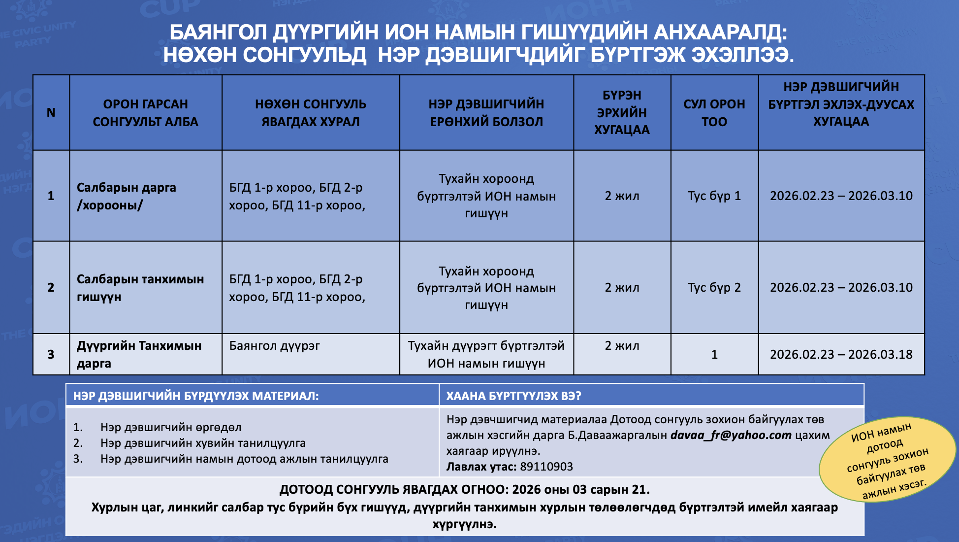 ИОН намын Дотоод сонгууль зохион байгуулах төв ажлын хэсгээс Баянгол дүүргийн хэмжээнд болох 2026 оны 3-р сард явагдах дотоод сонгуулийн зар хүргүүлж байн...