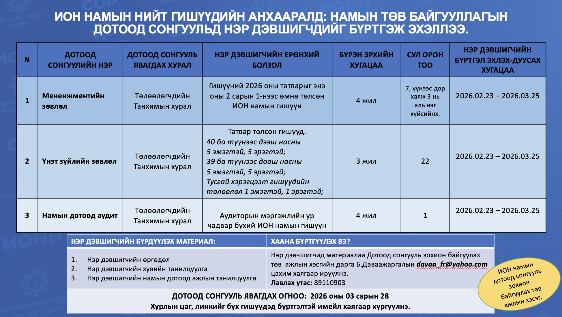 ИОН намын зарим төв байгууллагад дотоод сонгууль зарласныг Дотоод сонгууль зохион байгуулах төв ажлын хэсгээс нийт гишүүдэд мэдээлж байна. 2026 оны 3-р сарын 28-н...